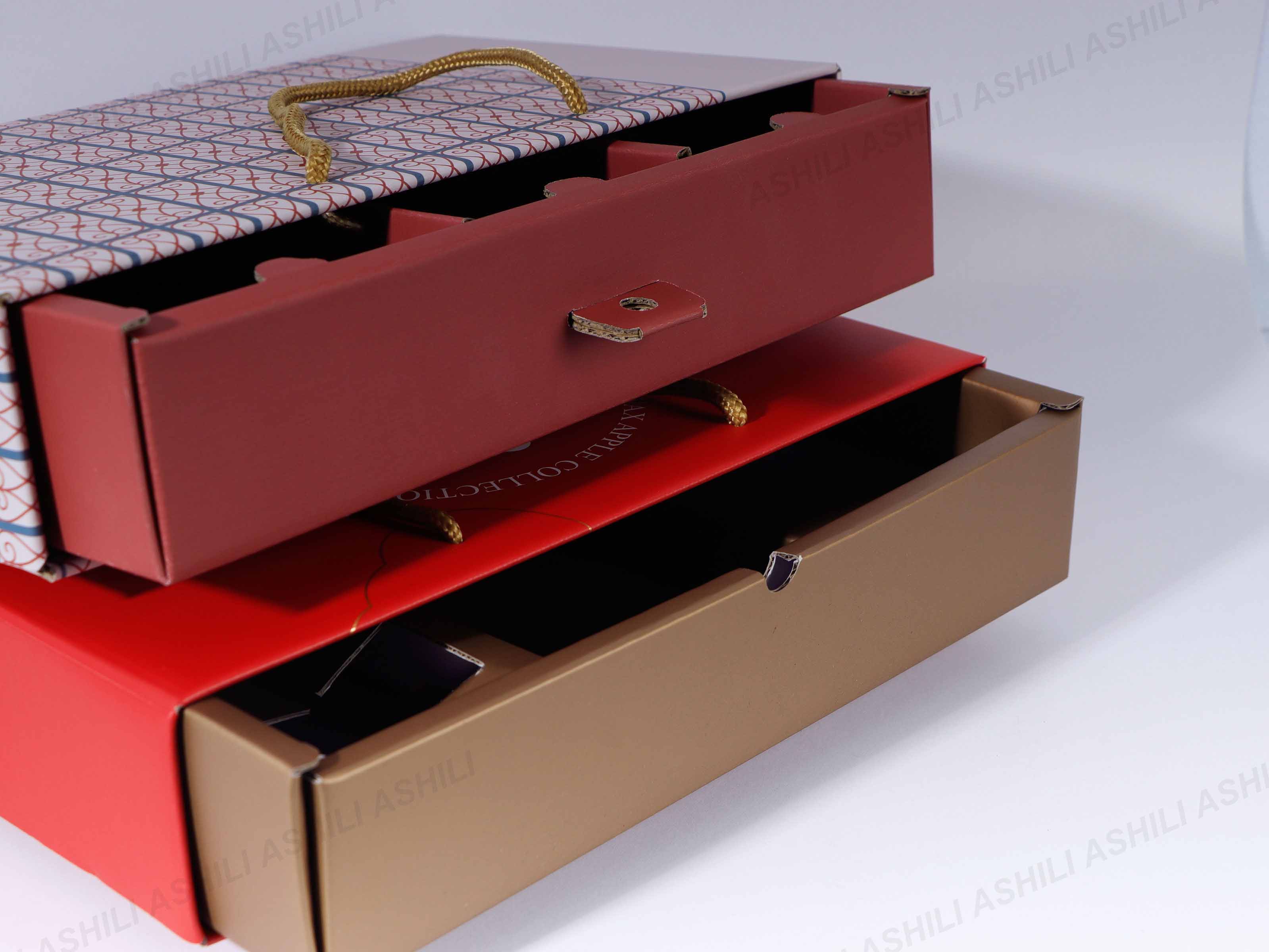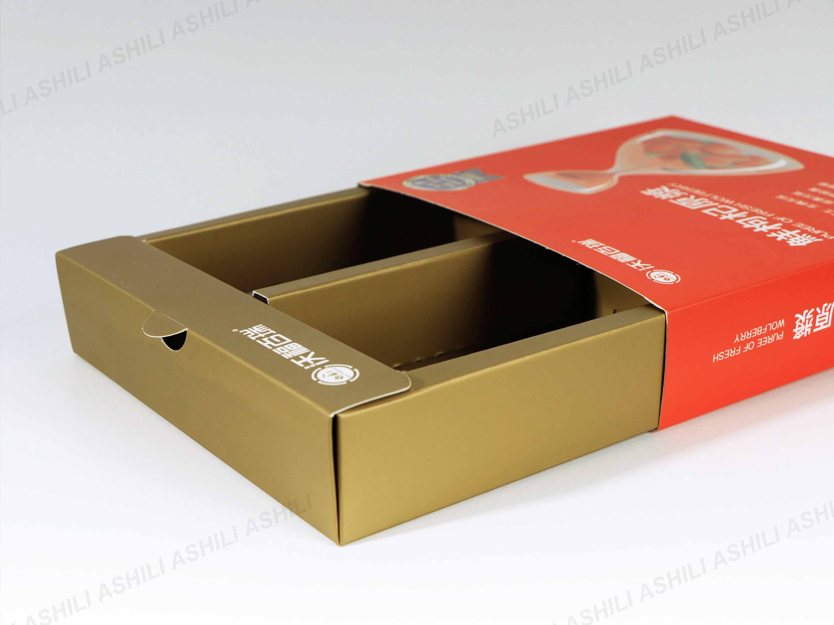 The pull-out box, also known as a drawer box, is suitable for designing long or small-sized products. The outer box can be designed for single-sided pull-out with a lid, preventing the product from falling out when standing upright. Alternatively, it can have a double-sided pull-out design, making it more intuitive and convenient for access.